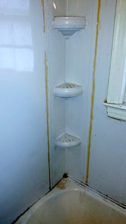 I also have to replace the caulk in the bathroom, though that’s not the tenant’s fault. Remember when I installed a tub surround in the bathroom and it was beautiful?