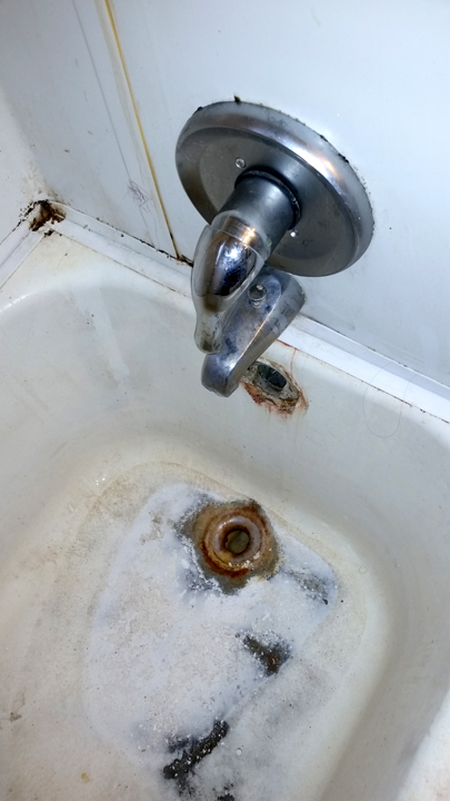 We’re going to have to refinish or replace the tub, too. Because the tub was clogged, the tenants either left the water sitting in it or put drain cleaner in it, which ruined the finish. It wasn’t perfect before, but now it’s awful.